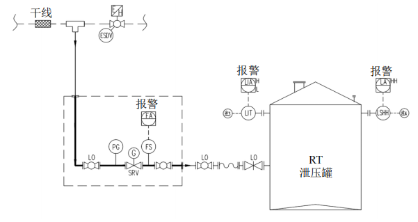 泄壓閥為水擊泄放系統關(guān)鍵設備[3],泄壓閥一旦失效將不能有效保障管道安全。傳統設計的泄放系統方法,當管道正常運行泄壓閥突然失效故障開(kāi)啟,站控室僅能收到報警信號,現場(chǎng)操作人員來(lái)不及去工藝區內關(guān)閉泄壓閥上游閥門(mén),可能會(huì )導致泄壓罐冒罐(圖 2),造成經(jīng)濟損失和社會(huì )影響。