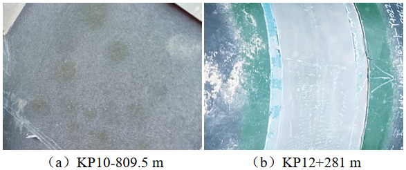 兩處聚氨酯防腐補口均存在黏結力降低問(wèn)題,其中,KP10-809.5 m存在鼓泡、流掛和積液現象,已基本喪失對管道本體的保護作用。由于液體聚氨酯補口施工對管道表面狀態(tài)、施工環(huán)境及操作均有較高要求[1],且聚氨酯涂層對陰極剝離較弱的抵抗能力[2],防腐層施工前對管體表面處理不達標、防腐層內部微觀(guān)缺陷的存在及過(guò)負的陰極保護電位引發(fā)的陰極剝離都可能導致鼓泡失效,因此需進(jìn)一步分析確定。