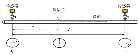 次聲波泄漏監測通過(guò)計算泄漏信號傳輸到安裝在管段兩端傳感器的時(shí)間差,結合信號在流體中的傳輸速度,計算泄漏點(diǎn)位置,如圖 1 所示。