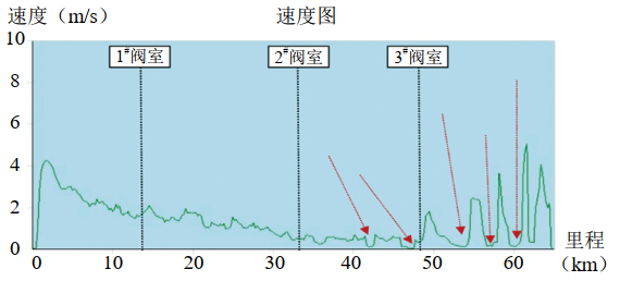 (3)檢測器運行數據分析。圖 3為檢測器運行速度曲線(xiàn),可以看出首站至2#閥室區間檢測器運行大體平穩,僅在直管段及彎頭位置存在停頓,此段檢測器皮碗輕微磨損無(wú)泄流情況,前方雜質(zhì)較少。2#閥室至末站區間,檢測器運行速度較慢,此段皮碗磨損加劇造成一定泄流及檢測器前方雜質(zhì)量較多造成多處長(cháng)時(shí)間停球。如圖中紅色箭頭所示,檢測器共發(fā)生5次較為明顯的低速停球,后續停球啟動(dòng)過(guò)程均與工藝操作相符。