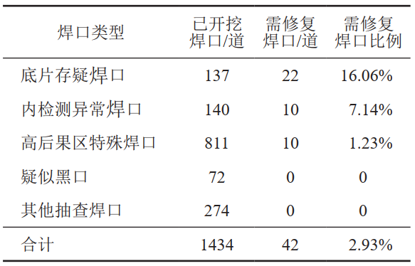 (5)焊口開(kāi)挖。截至2021年底,累計開(kāi)挖復拍焊口1434道,發(fā)現不合格焊口202道,不合格比例14.09%,需修復焊口42道,需修復比例2.93%,其中,含裂紋焊口8道,占比0.56%。焊口需修復比例及裂紋比例均低于集團公司平均統計水平。