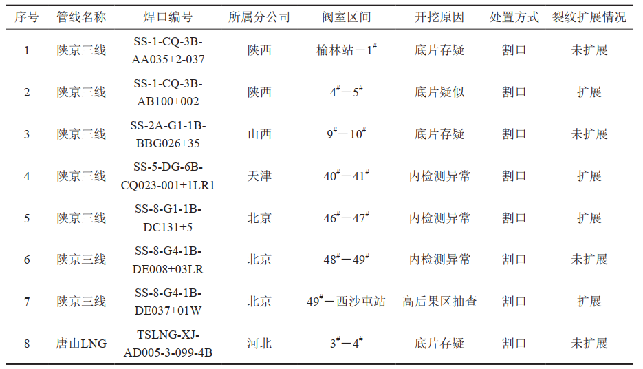 北京管道公司自2017年8月開(kāi)始對所轄陜京三線(xiàn)、永唐秦管線(xiàn)、唐山LNG外輸管線(xiàn)、大唐煤制氣干線(xiàn)、港清三線(xiàn)、寶香西管線(xiàn)、采通線(xiàn)、靖邊聯(lián)絡(luò )線(xiàn)、陜京二線(xiàn)9條管線(xiàn)共計2790多公里管道(表 1)、24.4萬(wàn)多道焊口進(jìn)行環(huán)焊縫質(zhì)量風(fēng)險排查。通過(guò)選擇性開(kāi)挖驗證,無(wú)損檢測再次檢驗,經(jīng)風(fēng)險評價(jià)對有缺陷的環(huán)焊縫采取補強或換管處理,降低管道安全隱患,為管道安全平穩運行打下堅實(shí)基礎。
