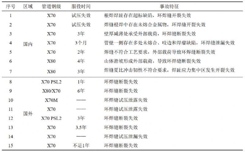 表 1 近年國內外高鋼級管道事故類(lèi)型及特征匯總