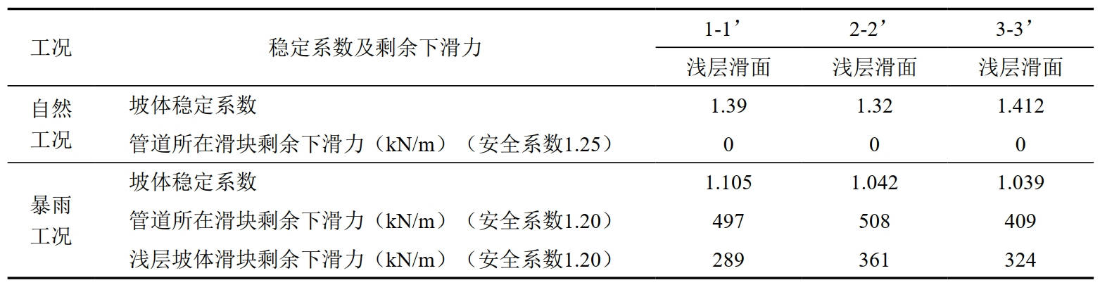 天然工況下各剖面的穩定性系數均在1.15以上,坡體及管道所在滑塊無(wú)剩余下滑力,說(shuō)明坡體淺層覆蓋層處于穩定狀態(tài);飽水工況下2-2'及3-3'剖面穩定性系數均低于1.05,管道所在滑塊剩余下滑力分別為497 kN/m、508 kN/m、409 kN/m,說(shuō)明在強降雨作用下淺層滑坡整體上處于欠穩定狀態(tài),為保障輸氣管道運營(yíng)安全,需采取治理工程進(jìn)行防治。