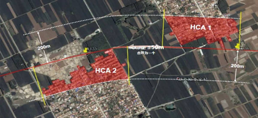 為了提高管理效率、降低管理難度和成本,將間隔小于50 m的同類(lèi)高后果區合并為一個(gè)高后果區管理(圖 5)。運行管理單位要采取管理措施或技術(shù)措施,減小高后果區管道泄漏的風(fēng)險,比如提高巡線(xiàn)頻次,加裝視頻監控設備等。