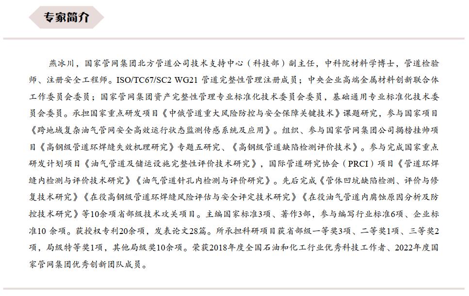 燕冰川:時(shí)代在不斷進(jìn)步,管道完整性管理也在不斷深化和提高,要求我們管理和技術(shù)人員要與時(shí)俱進(jìn),不斷提高認識和技術(shù)水平。本標準在制定過(guò)程中充分考慮到了適用性與先進(jìn)性的平衡,也考慮到了不同層次、不同角色的標準使用者。對于大多數的管道運營(yíng)企業(yè)和管理人員來(lái)說(shuō),了解本標準的主要內容,就可以組織好完整性評價(jià)工作。對于相關(guān)專(zhuān)業(yè)技術(shù)人員來(lái)說(shuō),在吸收本標準先進(jìn)理念和做法的基礎上,還要不斷鉆研、砥礪前行,才能推動(dòng)管道完整性管理不斷進(jìn)步。管道事業(yè)永無(wú)止境,任重道遠,讓我們共同努力。