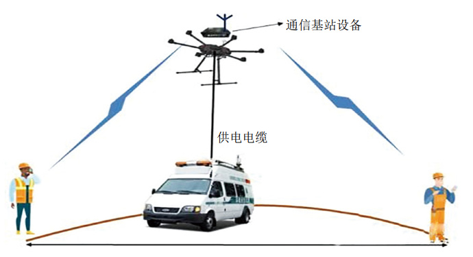 (1)擴大通信覆蓋范圍。應急救援現場(chǎng)環(huán)境復雜,各種樓宇、山丘等的遮擋直接影響了現場(chǎng)的通信傳輸及組網(wǎng)覆蓋范圍,極大地限制了應急通信的傳輸效果。隨著(zhù)無(wú)人機技術(shù)、通信組網(wǎng)技術(shù)的不斷發(fā)展和普及,使空中組網(wǎng)通信方式成為可能,有效擴大通信覆蓋范圍。系留無(wú)人機采用線(xiàn)纜供電,不受電池續航時(shí)間限制,可長(cháng)時(shí)間滯空懸停飛行,為救援現場(chǎng)提供穩定的中繼鏈路。利用系留式無(wú)人機將中繼設備或基站升至 100 m~200 m 高空,形成空中組網(wǎng)及空中覆蓋,從而使通信傳輸距離及覆蓋范圍擴大10倍以上。如圖 1所示。