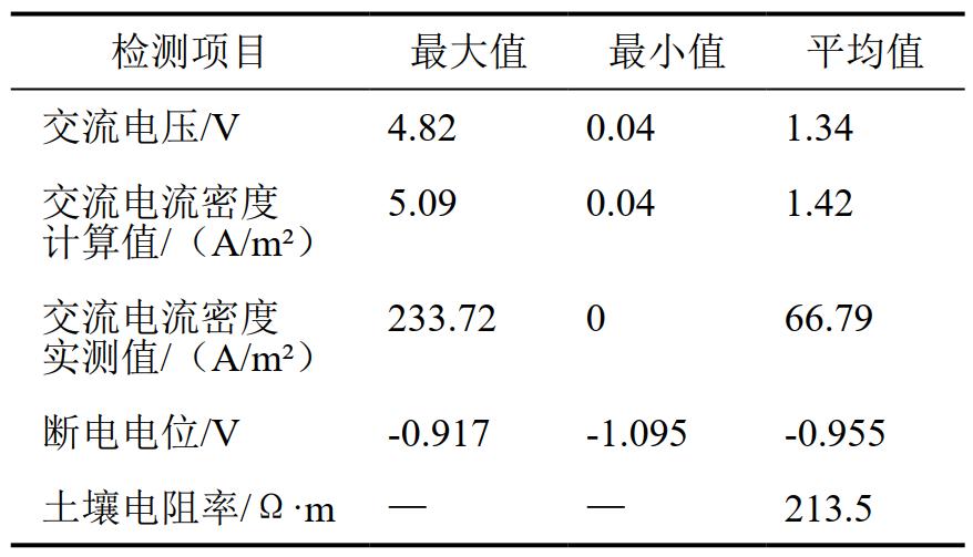某管道敷設環(huán)境為沙土,防腐層為3PE形式,測試樁距離鐵路約1.5 km,附近無(wú)高壓輸電線(xiàn)路,無(wú)明顯可見(jiàn)干擾源。2022年,針對該管道一處測試樁開(kāi)展雜散電流檢測工作,采用數據記錄儀對測試樁處交流電壓、交流電流密度、斷電電位進(jìn)行24小時(shí)檢測,結果發(fā)現,現場(chǎng)實(shí)測的交流電流密度值與通過(guò)GB/T 50698―2011 《埋地鋼質(zhì)管道交流干擾防護技術(shù)標準》推薦公式得出的計算值存在較大差異,如表 1所示。