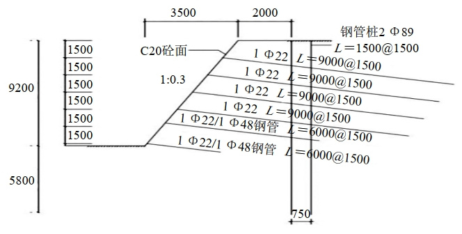 為打破土釘墻單一使用的局限性,提升土釘抗拔性能,將土釘墻支護技術(shù)與微型鋼管樁相結合,形成微型鋼管樁復合土釘墻技術(shù)。微型鋼管樁復合土釘墻支護體系是在土釘鉆孔施工完畢后,在斜坡頂部土釘空中間部位垂直置入鋼管,接著(zhù)向鋼管內利用高壓灌注水泥漿,沿邊坡頂部形成一定間距分布的一排微型鋼管樁。然后設置土釘和噴射混凝土面層,并與微型鋼管樁連成一個(gè)整體(圖 4)。