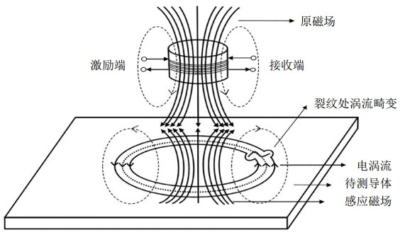電磁渦流檢測是基于電磁感應原理的一種無(wú)損檢測方法,其原理如圖 1所示。首先,通過(guò)激勵信號源產(chǎn)生標準的正弦交變電流通入檢測探頭的激勵端,交變電流使得檢測線(xiàn)圈周?chē)a(chǎn)生變化的磁場(chǎng),通常稱(chēng)該磁場(chǎng)為原磁場(chǎng)。變化的磁場(chǎng)又使得在待測導體內感應出電渦流信號。其次,導體中感應出的電渦流信號也會(huì )產(chǎn)生自己的磁場(chǎng)(通常稱(chēng)該磁場(chǎng)為感應磁場(chǎng)),渦流感應磁場(chǎng)同樣會(huì )與線(xiàn)圈發(fā)生電磁感應作用,進(jìn)而在線(xiàn)圈上感生電壓。當導體中某些因素發(fā)生改變,如出現缺陷或電導率、磁導率、形狀、尺寸發(fā)生變化時(shí),將影響渦流的強度和分布,進(jìn)而引起線(xiàn)圈感應電壓的變化。通過(guò)測定線(xiàn)圈感應電壓(阻抗)變化而實(shí)現無(wú)損檢測的方法就是渦流檢測。