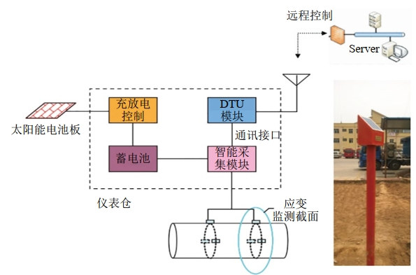 (1)監測裝置。野外監測裝置由太陽(yáng)能供電系統、智能采集模塊、DTU模塊、監測樁體四大部分組成(圖 1)。數據采集儀與振弦式應變計之間通過(guò)雙絞線(xiàn)實(shí)施通訊連接,振弦式應變計監測的振頻模數經(jīng)采集儀壓縮、存儲后,由數據采集儀通過(guò)DTU模塊連接到互聯(lián)網(wǎng),并通過(guò)網(wǎng)絡(luò )服務(wù)器與監控中心服務(wù)器連接,實(shí)現數據的采集或對現場(chǎng)數據采集儀發(fā)送相關(guān)測控指令。