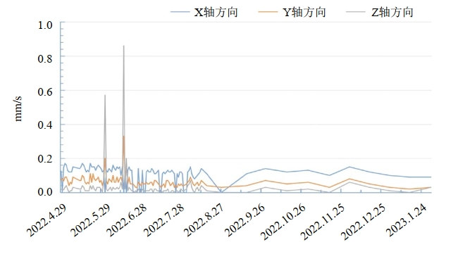 (4) 管道應力監測數據分析。施工后對管道應力應變、位移(沉降)、振動(dòng)實(shí)施9個(gè)月的現場(chǎng)監測。應力監測時(shí)程曲線(xiàn)如圖 3,在整個(gè)監測周期內,監測截面管道附加應力均處于較小值,最大拉應力6.93 MPa,最大壓應力﹣8.95 MPa,遠未達到藍色預警值。累積沉降位移變化曲線(xiàn)如圖 4,當前測點(diǎn)累積沉降位移值偏小,僅為﹣0.793 mm ,遠小于安全閾值10 mm。2個(gè)監測截面振動(dòng)速度隨時(shí)間變化曲線(xiàn)如圖 5、圖 6,各測點(diǎn)振動(dòng)速度值較小,均遠小于安全閾值。其中,Z01測點(diǎn)沿Z軸方向振動(dòng)速度最大值為0.86 mm/s,Z02測點(diǎn)沿X軸方向振動(dòng)速度最大值為0.31 mm/s,均小于管道安全速度1.7 cm/s。