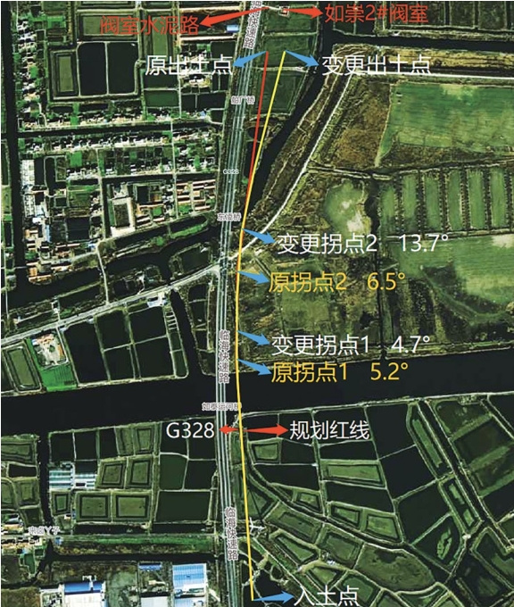 圖 1 定向鉆穿越走向圖(紅色為原路由、黃色為調整后路由)