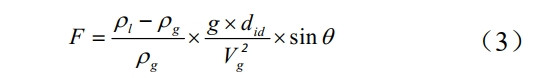 式中:F為作用在流體單位面積上的重力與慣性應力的比率;ρι和ρg 分別為液體和氣體密度,kg·m-3;g 為重力,m·s-2;did 為管道內徑,m;Vg 為表觀(guān)氣體速度,m·s-1;θ為傾斜角,°。