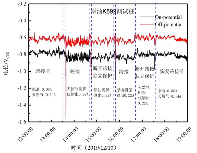 (5)天然氣陰極保護系統輸出時(shí)通電電位波動(dòng)幅度大于各陰極保護系統獨立輸出時(shí)通電電位波動(dòng)幅度,大于原油干線(xiàn)陰極保護系統輸出時(shí)通電電位波動(dòng)幅度,表明C站干線(xiàn)陰極保護之間相互干擾主要是由于天然氣陰極保護系統引起的。