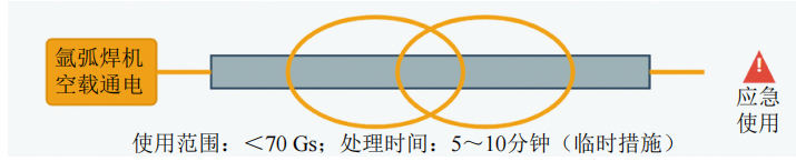 (1)完善剩磁檢測流程。為實(shí)現精準消磁,應將“磁場(chǎng)強度檢測”納入焊接前的強制工序。作業(yè)人員應在焊口組對完成后,使用便攜式高斯計沿焊縫兩側300 mm范圍內開(kāi)展全方位磁場(chǎng)強度測定,記錄最大值與偏吹方向,并標記殘磁區域。檢測結果需由專(zhuān)業(yè)人員簽字確認,并作為后續消磁方式選型依據(圖 6)。