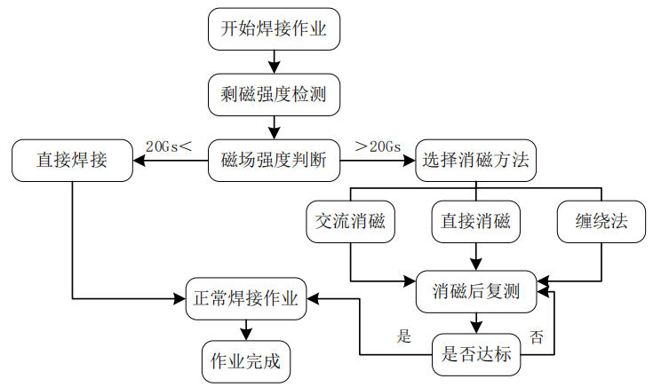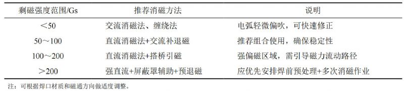 漏磁檢測雖提升了風(fēng)險識別能力,但剩磁影響不可忽視,對電弧引燃穩定性、熔池成型與焊接質(zhì)量存在顯著(zhù)干擾。不同剩磁強度需匹配不同消磁方法,交流消磁、直流消磁與纏繞焊把線(xiàn)法各有側重,應因地制宜使用。制度化、標準化是解決磁偏吹問(wèn)題的關(guān)鍵路徑,需從剩磁檢測、作業(yè)規范、技術(shù)培訓、設備選型等多維度協(xié)同推進(jìn)。數字化管理平臺有助于經(jīng)驗積累與快速響應,可作為技術(shù)傳承與智能分析的重要工具。