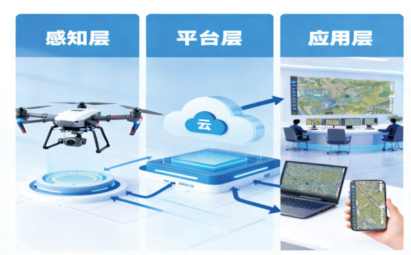 遵循數據驅動(dòng)、可視指揮與高效協(xié)同的核心原則,構建以無(wú)人機系統為主的感知層,以地理信息平臺為智慧中樞與協(xié)同樞紐的平臺層,以手機、平板電腦等終端為信息顯示與指令發(fā)布的應用層,系統性重塑從態(tài)勢感知到指揮決策,再到現場(chǎng)執行的全流程作業(yè)體系。