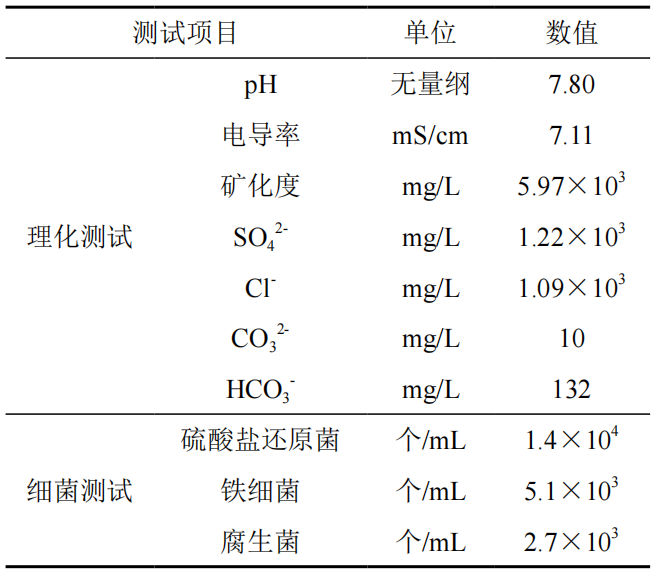 針對地下水樣進(jìn)行理化性質(zhì)分析,參照SY/T 0532―2012《油田注入水細菌分析方法 絕跡稀釋法》附錄Ⅲ采用測試瓶進(jìn)行水樣內硫酸鹽還原菌(SRB)、鐵細菌(FB)和腐生菌(TGB)的數目測定。測試結果如表 1所示,水樣pH為7.8,呈弱堿性,含鹽量較多。