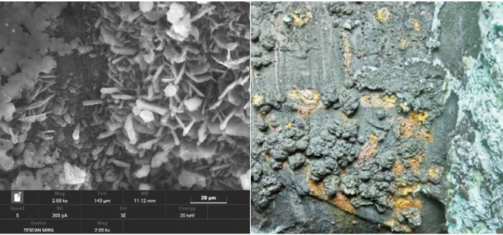 圖 1 腐蝕產(chǎn)物宏觀(guān)形貌和微觀(guān)形貌圖