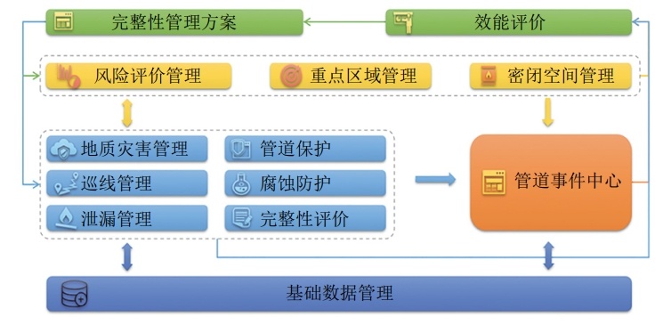 (1)總體功能設計。將城燃管道完整性管理相關(guān)業(yè)務(wù)融入數字化生產(chǎn)管理系統(以下簡(jiǎn)稱(chēng)系統),以系統基礎數據為前提,統籌建立各單位完整性管理方案,通過(guò)執行計劃任務(wù),實(shí)現量化考核。以風(fēng)險評價(jià)、重點(diǎn)區域和密閉空間的識別結果確定管理重心。以“線(xiàn)上+線(xiàn)下”結合的方式開(kāi)展管道巡檢、泄漏處置、第三方施工管控、腐蝕防護、災害防治等管理工作,實(shí)現管理模式的轉型(圖 2)。