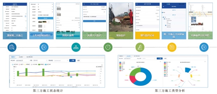 (6)維修與維護。針對可能造成嚴重后果的第三方損壞、地質(zhì)災害、腐蝕等風(fēng)險,采取多種手段實(shí)施管控(圖 5、圖 6),并在系統內實(shí)現全程監控。一是對高風(fēng)險管道閥井、周邊密閉空間、調壓箱(柜)等重點(diǎn)區域加裝無(wú)線(xiàn)可燃氣體泄漏監測及地災、水位、智能陰保和壓力監測設備,并接入系統監測。二是第三方施工監護實(shí)施分級管理,采用“人工監護+設置臨時(shí)視頻監控”,自發(fā)現施工事件至施工結束、現場(chǎng)驗收,通過(guò)系統實(shí)現閉環(huán)管理。三是對管道定檢、內外檢測發(fā)現的問(wèn)題形成系統數據,通過(guò)錄入管道缺陷信息、維修記錄,及時(shí)掌握管道缺陷變化情況,形成多輪檢測數據對齊。四是為預防各類(lèi)失效風(fēng)險編制現場(chǎng)處置預案,設置區域關(guān)閥分析、應急資源查詢(xún)等功能,開(kāi)展應急處置演練。
