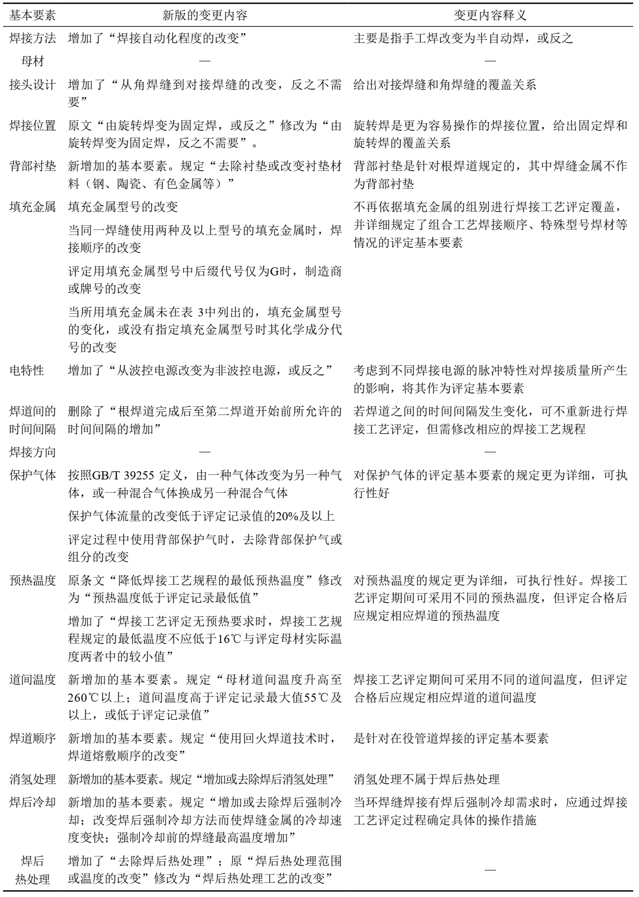 表 3 2023版標準中手工焊和半自動(dòng)焊焊接工藝評定基本要素的變化